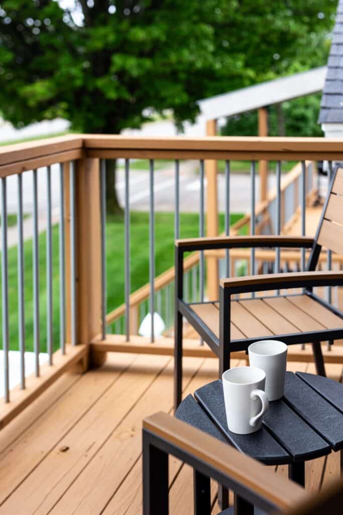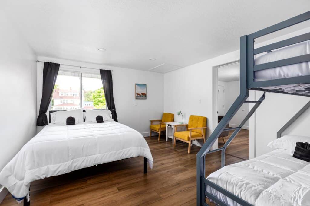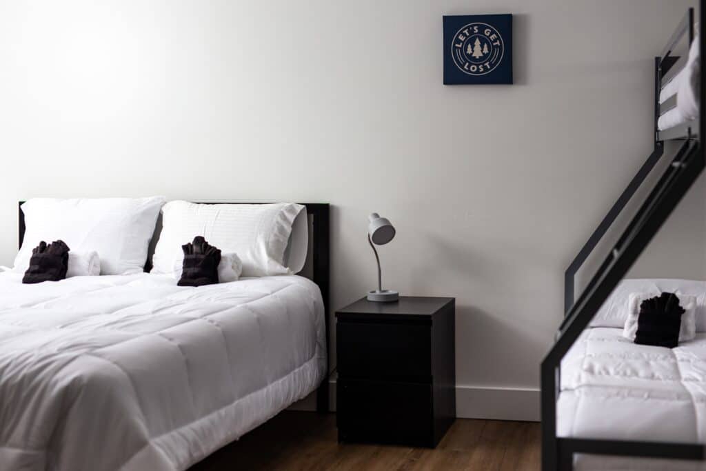 Mitten Flat #4 has its own private entertainment area right outside. This unit also has two bedrooms separated by a full en-suite kitchen and living area so you can sleep however you see fit. Enjoy access to the community hot tub, free wi-fi, outdoor grill and fire pit, on-site laundry, and all the space your party needs when traveling.